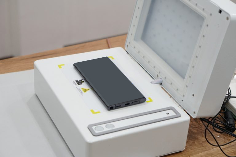 -B4: Sau đó dùng máy chiếu UV chuyên dụng để tiến hành làm khô keo. Với cách này sẽ giúp miếng dán bám chắc hơn ôm khít theo viền cong của máy